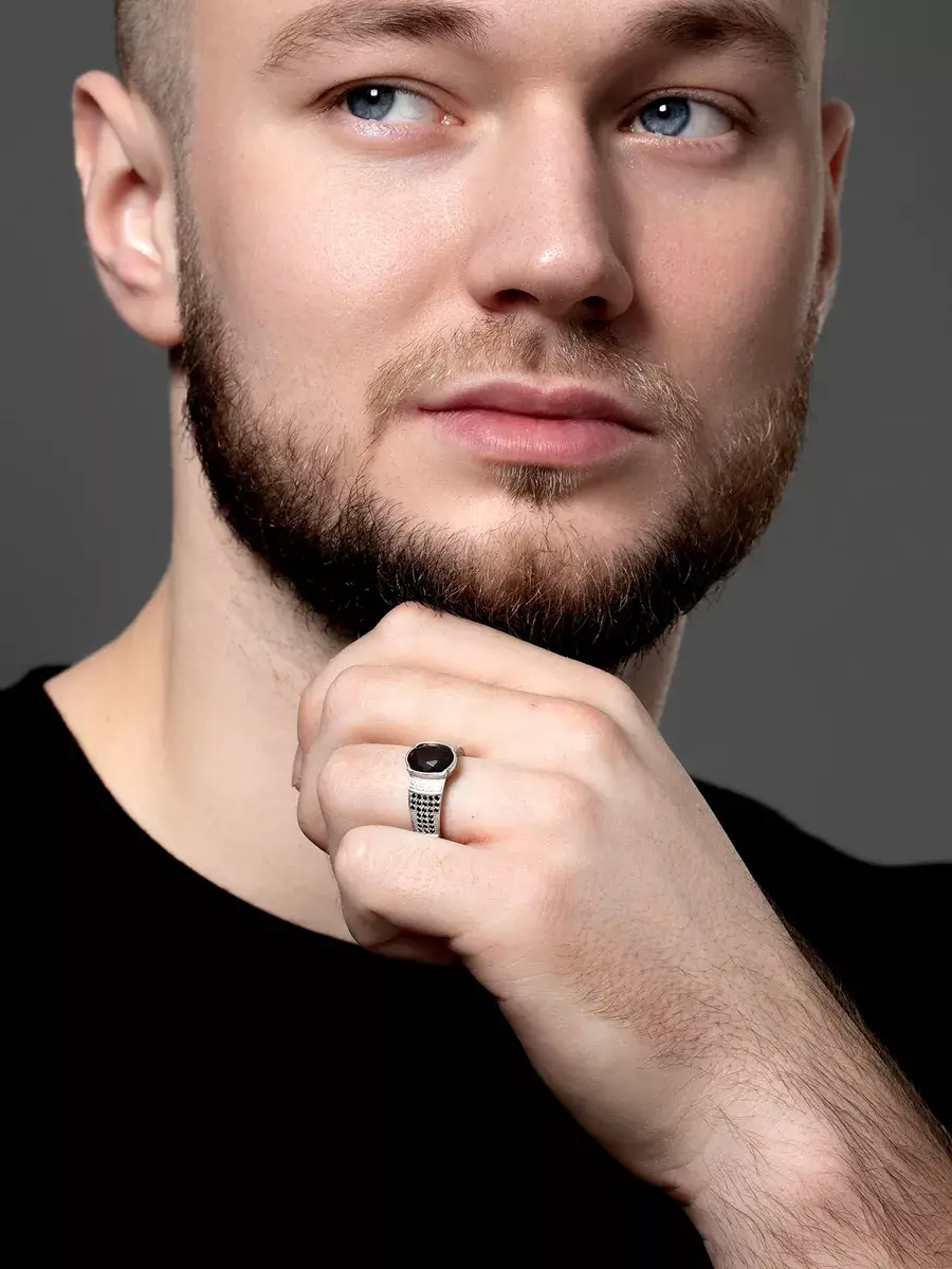 Ювелирная серебряная печатка с раух топазом. Изделие выполнено из серебра 925 пробы. Производство Россия. Ширина шинки - 2,8 мм. Ширина кольца - 11,1 мм. Вставка - 1 раух топаз ;шпинель круг.Минимальный вес зависит от размера. Наши ювелирные украшения не бижутерия! Мужское кольцо с ювелирными камнями придает кольцу уникальность. Кольцо сидит комфортно на любом пальце. Ювелирные украшения "AgafoNova999*" созданы радовать своего владельца день за днем. Оригинальное дизайнерское серебряное мужское кольцо перстень с ювелирными вставками будет гармонично сочетаться с другими аксессуарами и станет отличным дополнением к вашему образу. Красивый серебряный перстень с камнями сможет элегантно подчеркнуть мужественность своего владельца. На руке такая драгоценность выглядит очень аккуратно и стильно. Кольцо - перстень прекрасно на каждый день, а также дополнит вечерний, праздничный или свадебный образ. Крупный перстень печатка 925 пробы идеально для подарка мужу, подарок парню, любимому, папе, дедушке, брату, внуку, племяннику, крестнику, другу, а также станет отличным подарком на день рождения, на новый год, 23 февраля, 14 февраля, юбилей, серебряные мужские печатки, перстни, кольца, массивные, крупные, легкие; праздничные, на каждый день, со вставкой, без вставки. В комплекте с кольцом идет брендовая подарочная упаковка. Значение веса в характеристиках может незначительно отличаться от действительного.